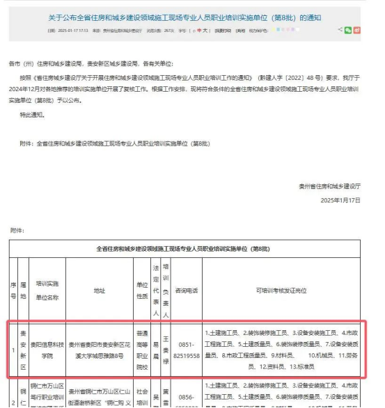 新闻网讯(供稿/供图 土木工程学院)近日,在贵州省住建厅的指导下,贵安新区城建局及学校领导的大力支持下,经过pp电子官方网站土木工程学院院长王贵禄、副院长蔡平、办公室主任付豪等人的努力,pp电子官方网站成功申报成为贵州省住房和城乡建设领域施工现场专业人员培训实施单位。