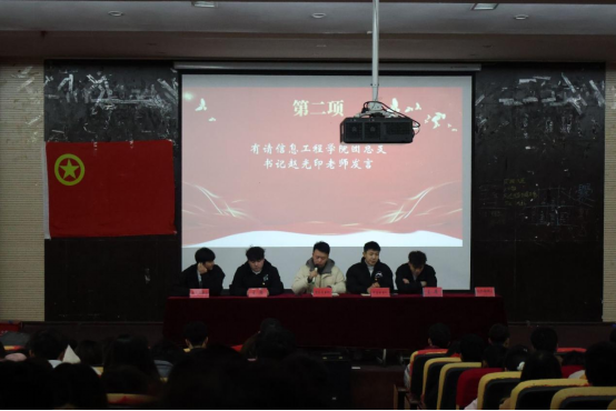 大会分为八项进行。赵光印致开幕词并向大家汇报本学期未来一段时间内相关工作的安排。他提到,团支部应积极响应校团委的号召,在本学期组织开展多项富有意义的活动,如“学雷锋志愿服务月”“支部先锋活动”“举办体育节等系列活动”等,进一步增强团员们的凝聚力,提升大家的社会责任感和实践能力。