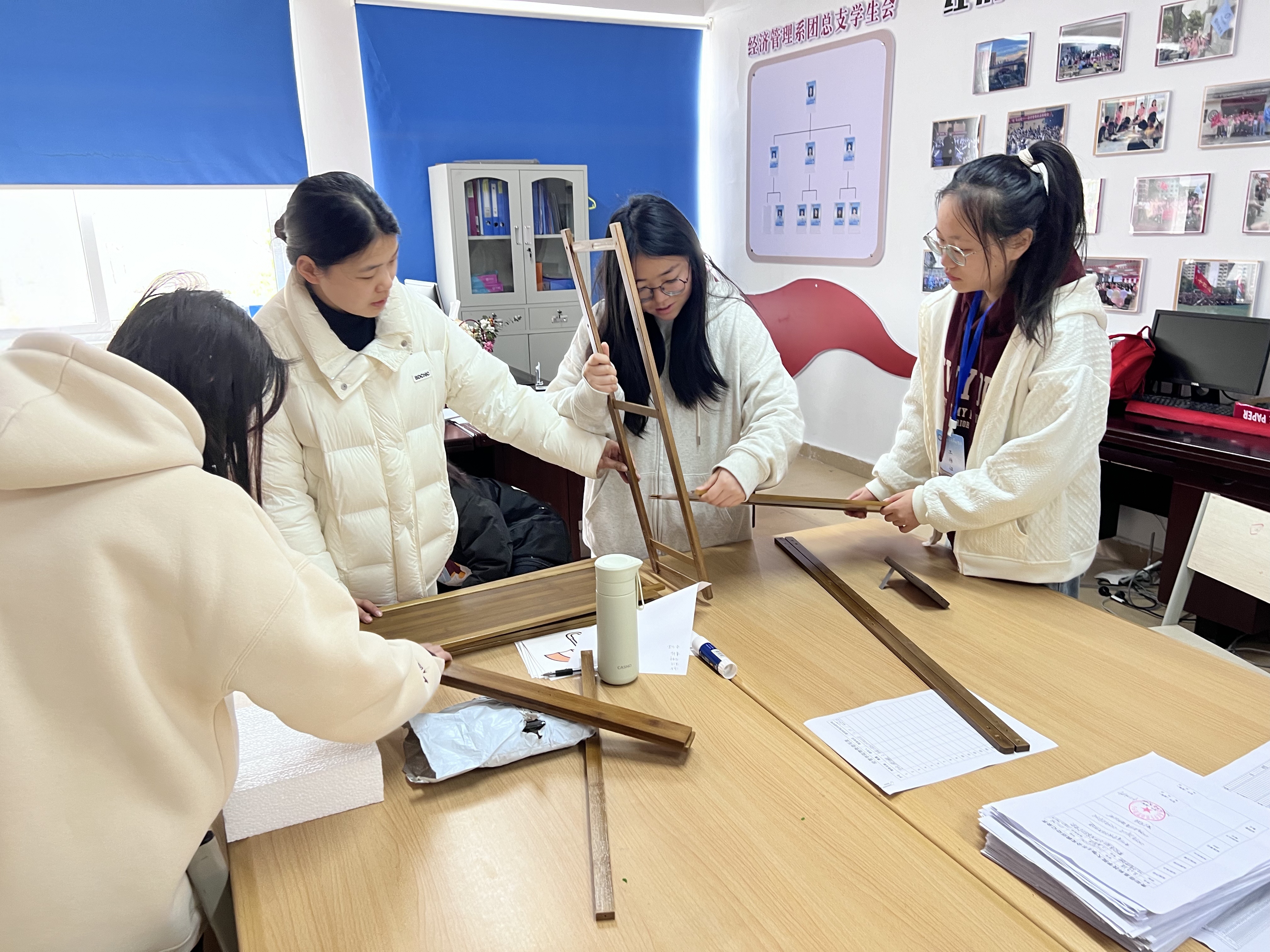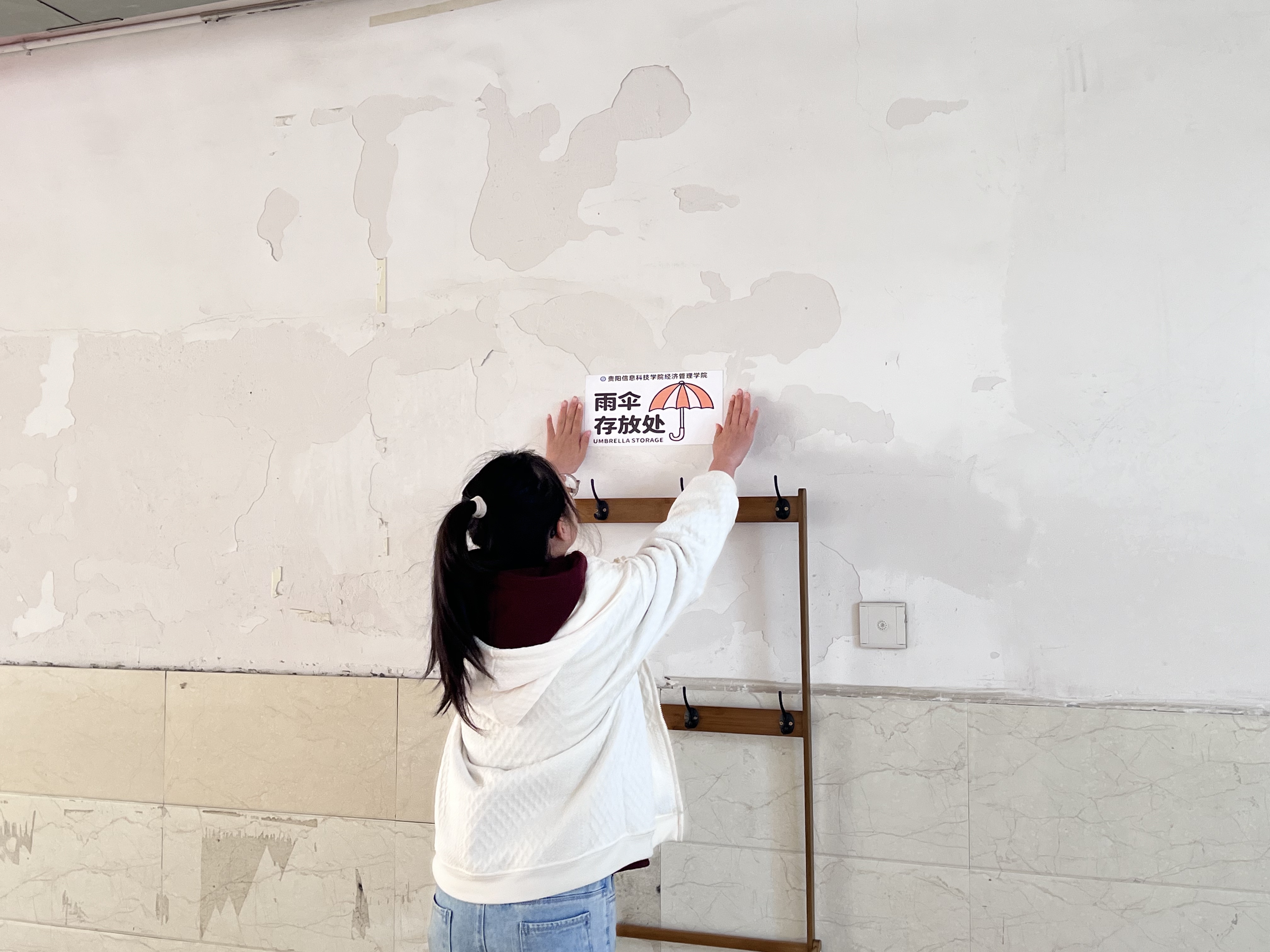 汗水浇灌细节,行动诠释担当。安装当日,成员们化身“校园工匠”:量尺寸、打孔、拧螺丝……走廊里此起彼伏的工具声与欢笑声交织成特殊的乐章。学生会宣传部同学全程跟拍,镜头中的画面令人动容——素拓部同学帮忙调整支架高度,确保伞架不占用通行空间;学生会体育部同学反复测试承重,笑称“要让每把伞都像被同学拥抱一样安稳”。