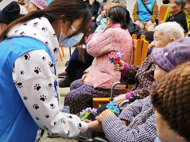 活动现场,志愿者们为老人们献上了精心准备的节目。一曲《童年》,悠扬的旋律瞬间唤起老人们的青春记忆,不少老人跟着节奏轻轻哼唱。活泼俏皮的手势舞,灵动的动作逗得老人们开怀大笑,脸上的皱纹里都满是快乐。表演结束后,志愿者们还耐心带领老人们做起手指操,同时送上亲手制作的扭扭棒花束。老人们也兴致勃勃,纷纷一展歌喉,现场气氛其乐融融。