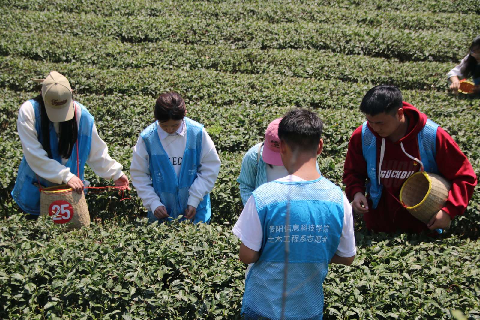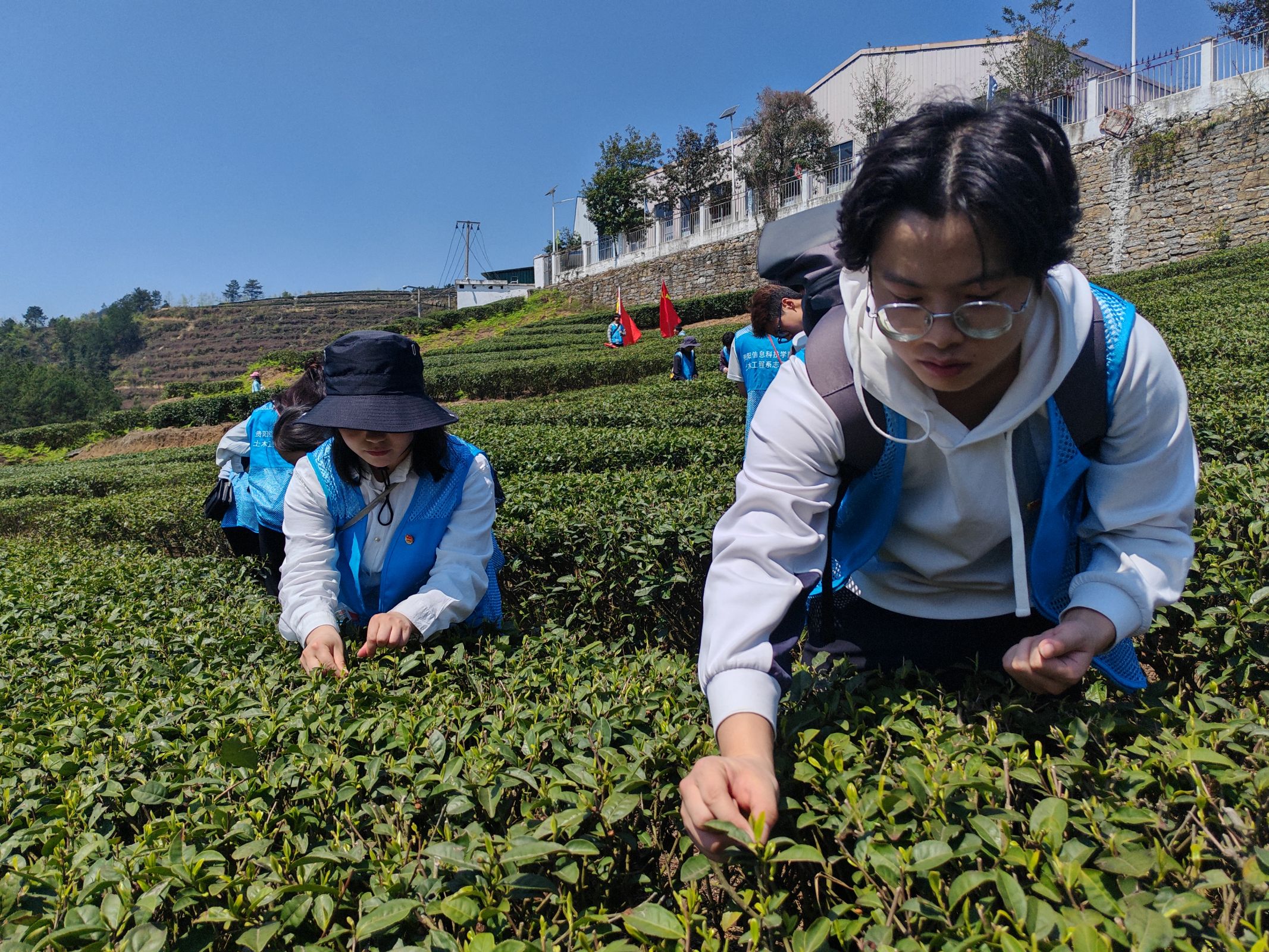 当日下午,师生奔赴新山村茶园基地,在茶农的指导下开展了“指尖嫩芽、助农采茶”志愿服务。在骄阳炙烤下,师生们弯腰穿梭于层层叠叠的翠绿茶丛。经过一下午的辛苦劳作,茶篓里的茶叶仅能覆盖篾筐底部,师生们后背早已洇出盐霜般的汗渍,体会到了茶农“采得春茶换得忙,半斤嫩芽十滴汗”的艰辛,亦进一步增强了服务群众的意识。