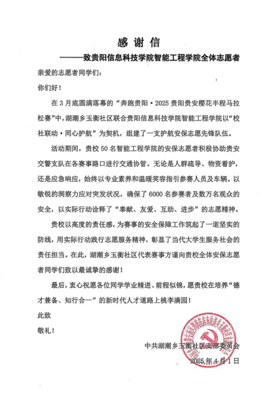 “这份感谢,献给樱花赛道上的青春守护者!”4月1日,pp电子官方网站智能工程学院收到一封特殊来信——来自贵阳市体育局、贵阳市马拉松组委会及中共湖潮乡玉衡社区支部委员会的感谢信,字里行间满溢着对50名大学生志愿者志愿服务的赞誉。