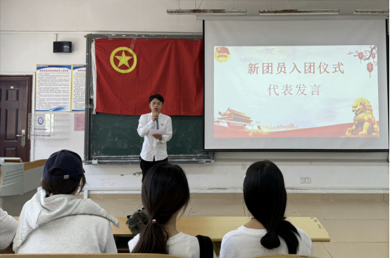 新团员代表宋春颖同学在发言中表示,加入共青团令她倍感自豪,未来将以团员标准严格要求自己,在学习中勇攀高峰,在实践中锤炼本领。老团员代表胡荣发同学结合自身经历,分享了作为共青团员的成长感悟,并鼓励新团员珍惜身份,充分发挥模范带头作用。仪式最后,团总支书记马瑞老师寄语新团员,强调团员身份不仅是荣誉,更是责任,希望他们牢记入团初心,践行誓言,在学习和生活中主动担当、积极作为。