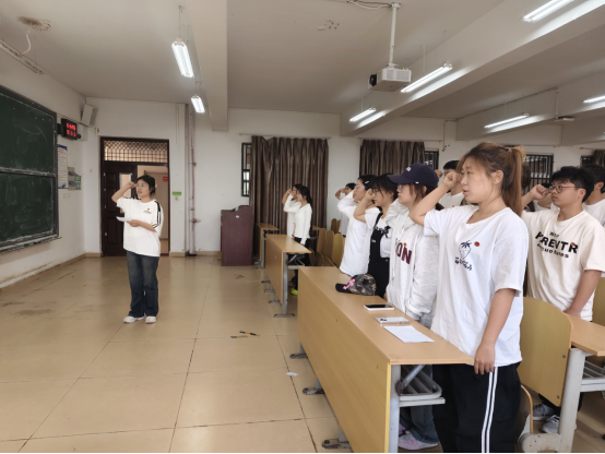 仪式在激昂的《光荣啊,中国共青团》团歌声中拉开序幕。主持人宣读新团员名单后,老团员们为新团员佩戴团徽。熠熠生辉的团徽别在胸前,既是共青团员身份的象征,更承载着共青团的光荣历史与使命担当。随后,在领誓人的带领下,新团员们右手握拳,面向团旗庄严宣誓:“我志愿加入中国共产主义青年团……”铿锵有力的誓言在教室内回荡,彰显出他们对共青团组织的坚定信念和为共产主义事业奋斗终身的决心。