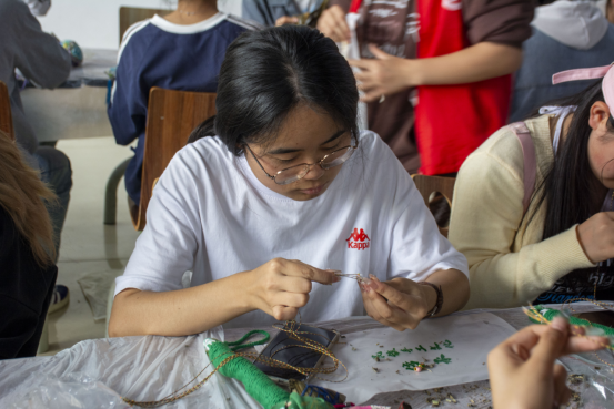 五彩绳编织区最为热闹。红、黄、蓝、白、黑五种象征五行与吉祥的丝线在同学们灵巧的手指间翻飞。大家自学教程,或互相请教,学习着平结、金刚结等传统编法。一根根色彩绚丽、寓意驱邪避灾、祈福纳吉的五彩手绳逐渐成形,被大家欣喜地系在手腕上。手腕间跳跃的色彩,不仅装点了节日,更成为联结传统与现代的生动纽带。
