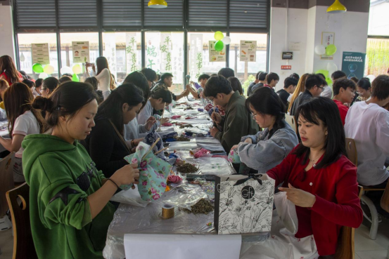 香囊制作区则充满了宁静专注的气息。五颜六色的精美香囊袋、芬芳四溢的艾叶、薄荷、丁香、陈皮等天然药材整齐摆放。同学们挑选心仪的布袋,巧手打结,将饱含祝福与健康寓意的香料包裹其中。小小的香囊,倾注着对平安健康的祈愿和对传统文化的敬意。