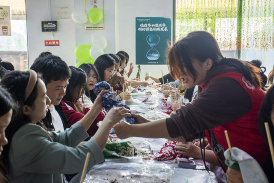 活动伊始,艾草的独特清香便弥漫开来。在艾草养生捶制作区,同学们在工作人员的示范下,兴致勃勃地将晒干的艾草叶小心翼翼地填充进特制的棉布袋中。随着木柄的安装与棉绳的缠绕固定,一个个兼具实用与美感的艾草养生捶在同学们手中诞生。大家互相交流着制作心得,了解着艾草温经通络、驱邪避秽的传统养生智慧。