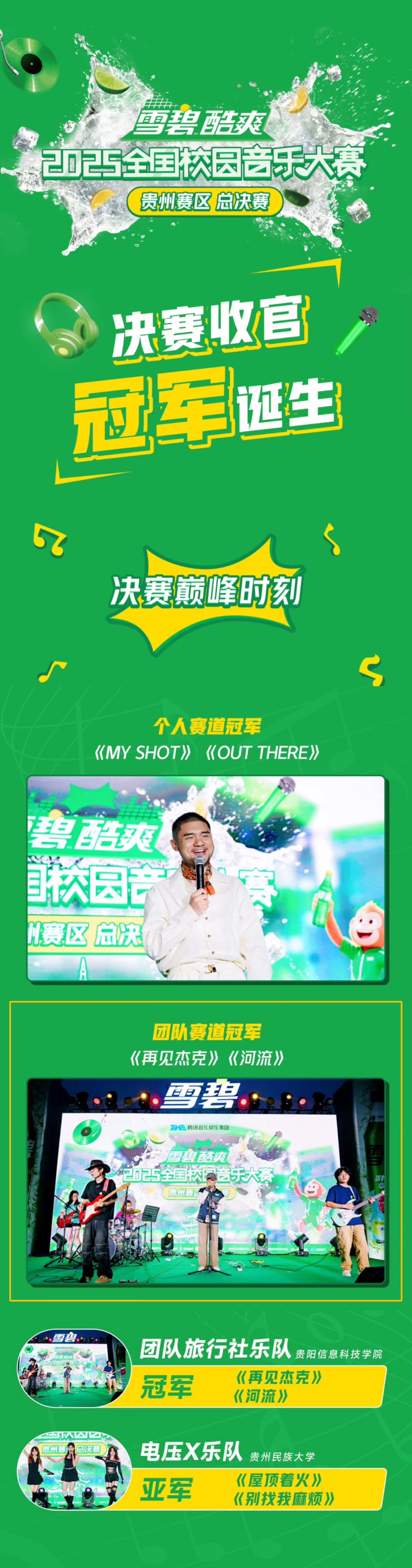 6月1日,“雪碧酷爽2025全国校园音乐大赛”贵州赛区总决赛成功落下帷幕。pp电子音乐协会学生余思豪、王松、杨紫龙、罗子彤、马安琪、李应勇组成的“团队旅行社乐队”经历海选、半决赛的层层选拔,在全省上千名选手中脱颖而出,成功晋级决赛,并以独特的音乐风格和极具感染力的表演,一举夺得团体赛道冠军,为学校赢得了荣誉。