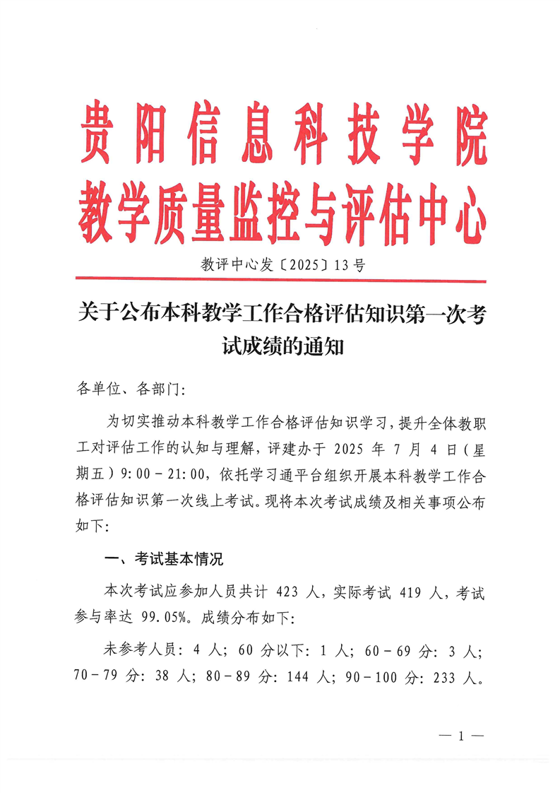 关于公布本科教学工作合格评估知识第一次考试成绩的通知