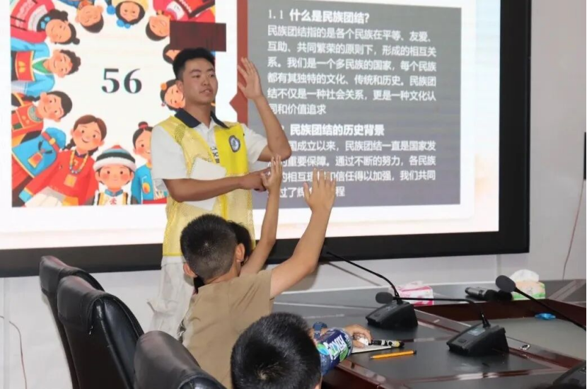 活动于下午14时开始,巧妙融合理论宣讲与趣味互动。实践队成员王烨帆通过主题分享,生动展示了各民族绚丽的服饰、独特的节日习俗与丰富的文化符号。从蒙古族的那达慕到傣族的泼水节,从藏族的雪顿节到布依族的三月三,精美的图片与视频带领孩子们畅游民族文化长河,现场惊叹连连。互动环节,“民族萝卜蹲”游戏将气氛推向高潮。孩子们化身苗族、布依族、彝族、傣族代表,在指令声中敏捷反应,欢声笑语洋溢广场,阳光下的跃动身影充满童真活力。随后的趣味问答环节,孩子们更是热情高涨,踊跃抢答,求知的目光与收获礼物的喜悦交织。