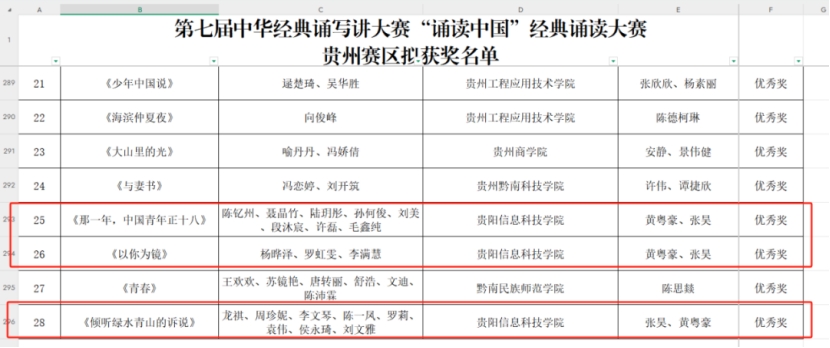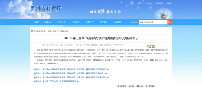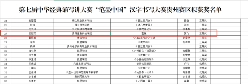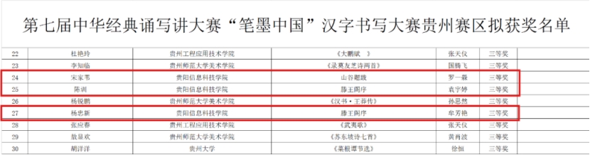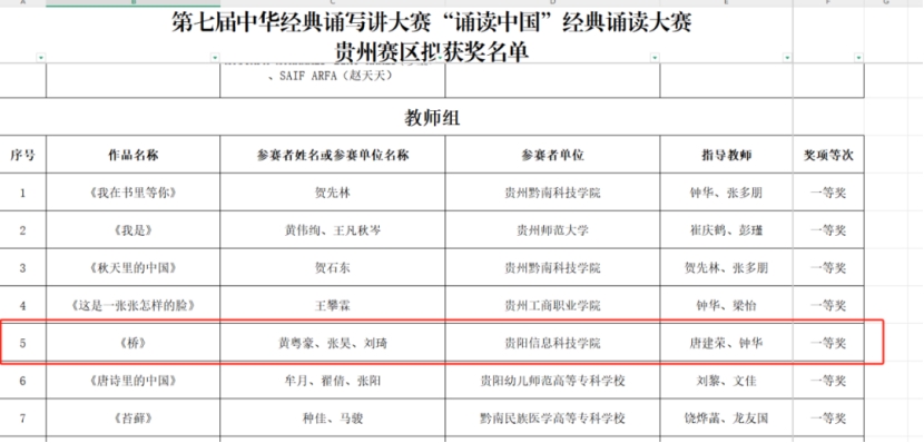 近日,贵州省第七届中华经典诵写讲大赛评审结果正式公布,pp电子师生凭借扎实的专业素养与创新精神,在多个项目中脱颖而出,斩获佳绩,为学校荣誉榜再添光彩!