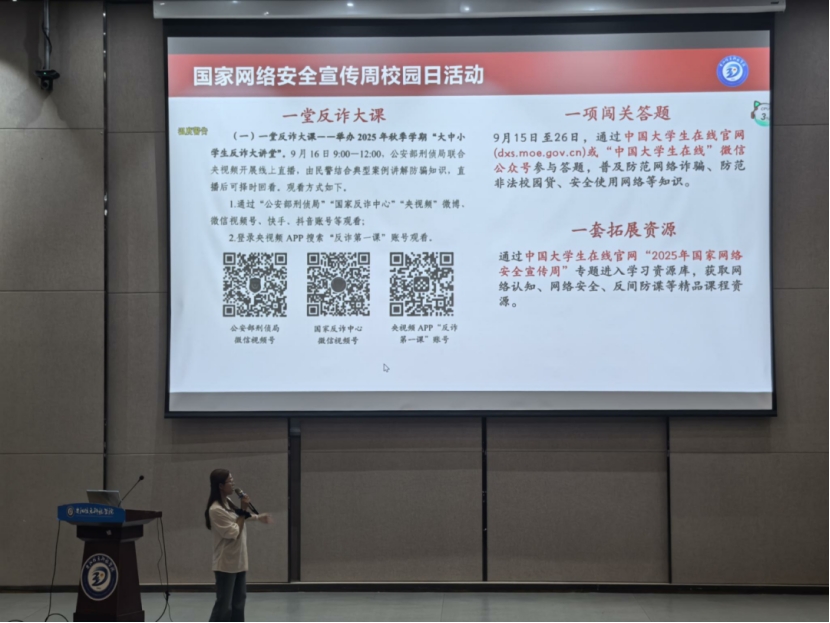 培训尾声,主讲人介绍补录学分申请流程,分享2025级咨询群信息。结合“2025年国家网络安全宣传周——网络安全为人民,网络安全靠人民,以高水平安全守护高质量发展”主题,预告后续系统操作与网络安全专题讲座,持续为新生提供支持帮助。
