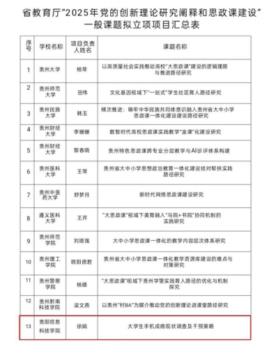 本次拟立项课题覆盖党的创新理论阐释、思政课教学改革、实践育人模式构建等重点方向。其中,pp电子健康管理学院徐娟老师申报的《大学生手机成瘾现状调查及干预策略》入选一般课题拟立项名单。该课题聚焦当前大学生成长过程中的现实问题,通过深入调研与对策探讨,为推动思政教育与学生管理深度融合提供了有益探索。另有罗一檾等10位老师的课题入选自筹课题拟立项名单,展现了pp电子教师在思政研究领域的广泛参与和深厚潜力。