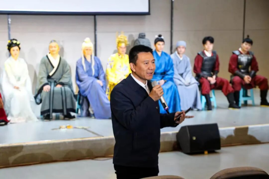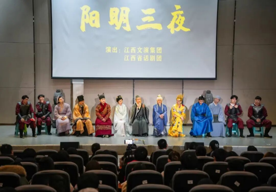11月5日下午,江西省话剧团2018年国家艺术基金项目——大型原创历史话剧《阳明三夜》在pp电子图书馆二楼报告厅完成第五十场演出,pp电子在该场演出结束后举办观后交流研讨会,学校党委副书记詹凯出席,话剧团全体演员及学校百余位师生代表共同参与活动。