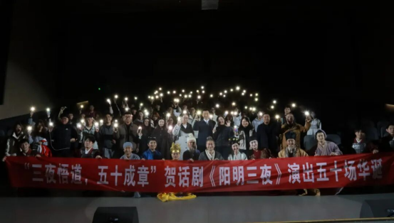 据悉,自2017年创排至今,《阳明三夜》已历经八载打磨,足迹遍布合肥、赣州、贵阳、南昌等地。11月4日至5日,该剧在学校连演三场,其中5日下午的场次正是其巡演第五十场,特殊的意义让现场观演氛围格外浓厚。演出过程中,同学们自发在朋友圈记录观剧心得,“在第五十场的舞台上遇见王阳明,这份共鸣格外珍贵”“‘此心光明’四个字,值得记一辈子”等感悟刷屏社交平台,对话剧艺术表现力的认可与对心学思想的热议交织升温。