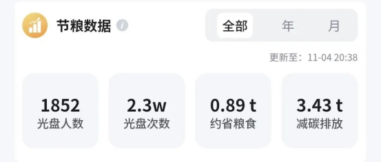 为迎接第45个世界粮食日,响应习近平主席光盘行动号召,弘扬勤俭节约的优良传统,pp电子伙委会于10月15至10月25日,在线上开展了“节俭始于心,光盘践于行”光盘打卡主题活动,共有2000人报名参与,1852人加入活动组织,累计光盘打卡2.3万次,约省粮食0.89吨,减碳排放3.43吨。