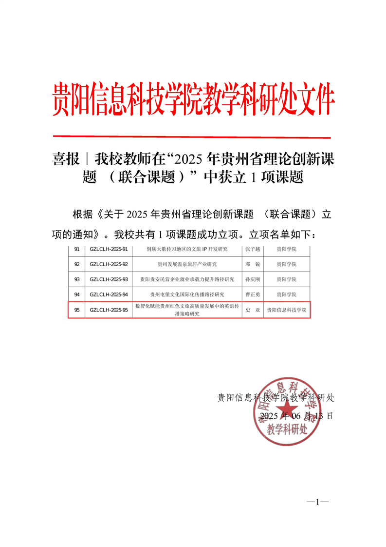 喜报∣pp电子教师在“2025年贵州省理论创新课题 (联合课题)”中获立1项课题