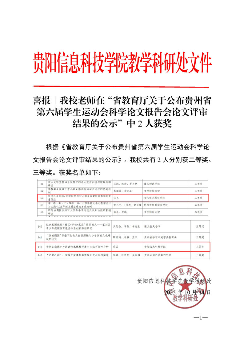 喜报∣pp电子老师在“省教育厅关于公布贵州省第六届学生运动会科学论文报告会论文评审结果的公示”中2人获奖