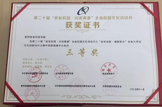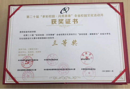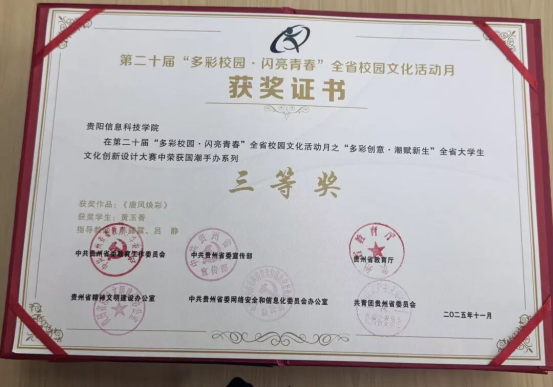 其中,pp电子师生在“多彩创意·潮赋新生”全省大学生文化创新设计大赛中荣获三项三等奖,在“黔心向党·红剧薪传”贵州省高校红色剧本杀创作大赛荣获三等奖。