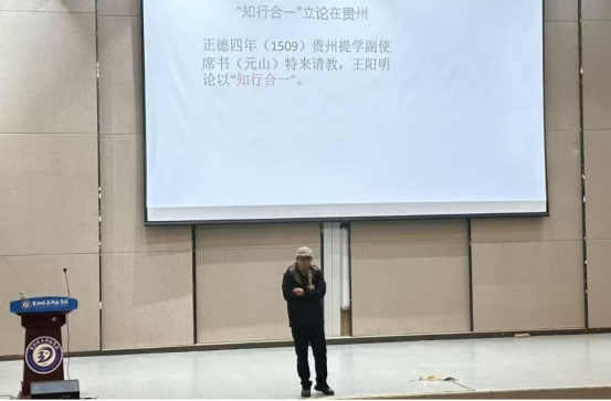 讲座伊始,黄晓儒系统梳理了王阳明在贵州龙场的悟道历程。正德年间,35岁的王阳明仗义执言触怒阉党,被捕入狱,遭受廷杖之刑,而后被贬至贵州龙场驿。王阳明抵达龙场时,此地仍属水西土司贵荣辖下尚未完全开化的区域,生存环境恶劣。但身处困厄他依旧坚持圣人本心,他以溶洞为栖身之所,静坐沉思,钻研经典,开启了对生命价值体系的探寻,最终在绝境中参悟出“圣人之道,吾性自足,向之求理于事物者误也”,提出“知行合一”,奠定了其心学理论的基础。