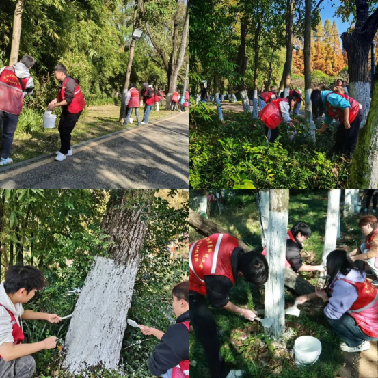 为化解实践技术难点,活动启动前一周,负责人已与花溪公园管理处完成对接,敲定流程并邀请园林师傅担任技术指导。在公园林荫道间,同学们分组协作、各司其职:有的清理树皮杂质,为刷白工作筑牢基础;有的双人配合,一人扶桶、一人涂刷,确保涂层平整无遗漏;有的主动承担体力任务,搬运石灰桶、整理工具,随时补位支援。身穿红马甲的身影穿梭林间,同学们汗流浃背却毫无怨言,在相互协作中传递团结力量与青年担当。