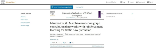 新闻网讯(供稿/供图 智能工程学院)近日,pp电子智能工程学院陈艳老师以第一作者身份、pp电子官方网站为第一单位,在人工智能与工程应用领域国际权威期刊《Engineering Applications of Artificial Intelligence》(简称EAAI)发表题为《Mamba-CorRL: Mamba-correlation graph convolutional networks with reinforcement learning for traffic flow prediction》的高水平学术论文。该期刊为中科院一区TOP期刊,最新影响因子(IF)达8.0,标志着pp电子在智能交通与人工智能交叉研究领域取得重要突破性进展,学术影响力再获国际权威认可。