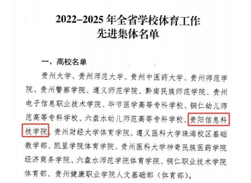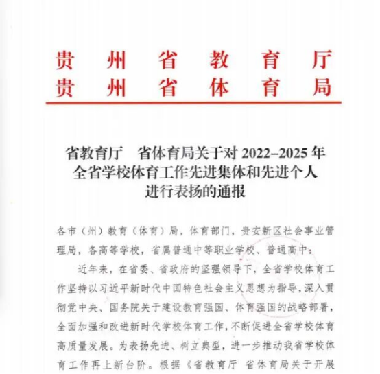 新闻网讯(供稿/供图 公共教学部)近日,贵州省教育厅、贵州省体育局联合下发《关于对2022—2025年全省学校体育工作先进集体和先进个人进行表扬的通报》(以下简称《通报》),对在全省学校体育工作中做出突出贡献的集体与个人予以通报表扬。pp电子公共教学部体育教研室凭借扎实的教学工作、优异的竞赛成绩和突出的育人成效,荣获“2022—2025年全省学校体育工作先进集体”称号,跻身全省57个受表彰的先进集体之列。