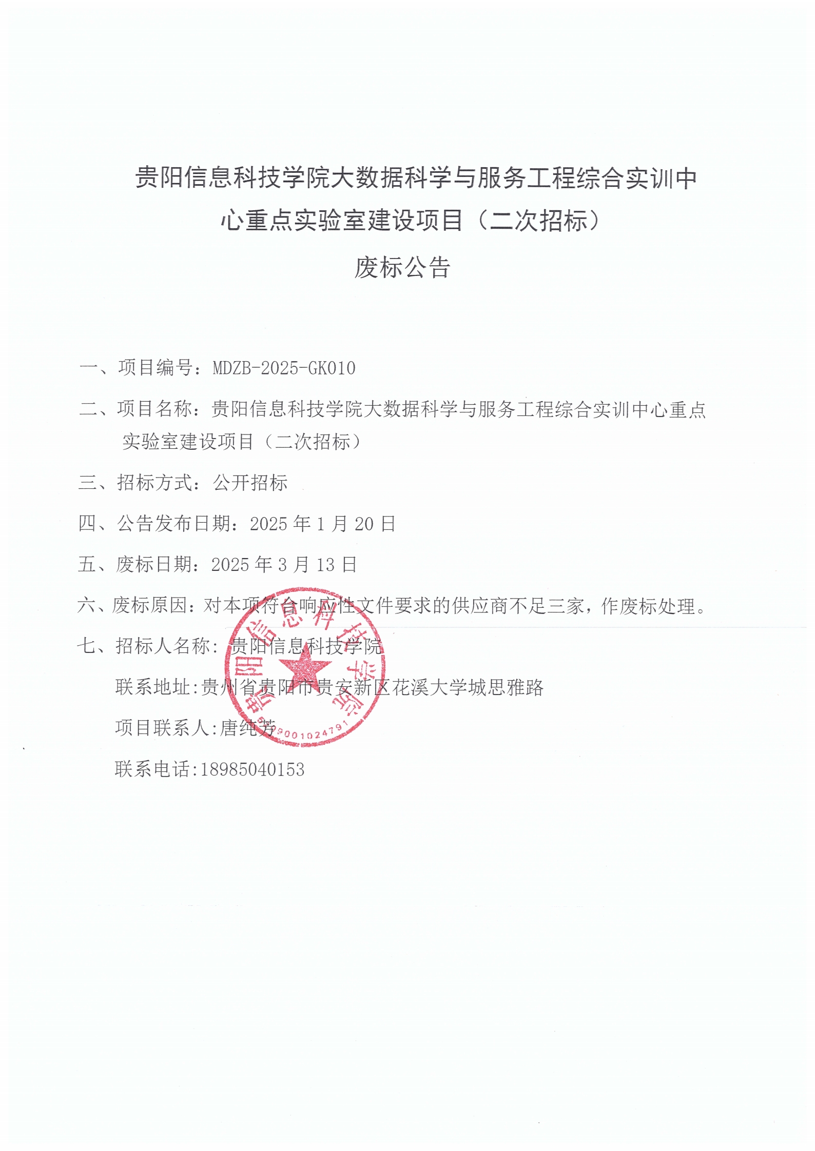 pp电子官方网站大数据科学与服务工程综合实训中心重点实验室建设项目(二次招标)废标公告