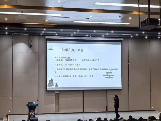 讲座中,黄晓儒以王阳明与贵州的深厚渊源为切入点,系统梳理了王阳明的生平轨迹与思想发展历程,重点解读了其被贬贵州龙场驿丞期间,于逆境中潜心参悟、完成“龙场悟道”的重要历程,阐释了“圣人之道,吾性自足,向之求理于事物者误也”的思想内核,还原了阳明心学在贵州落地生根的历史脉络。同时,讲解了王阳明在贵州期间兴办龙冈书院、文明书院,写下《瘗旅文》《象祠记》等传世名篇,以“立志、勤学、改过、责善”为教化诸生,推动儒学在贵州的传播发展,为贵州人文精神的形成筑牢了文化根基。