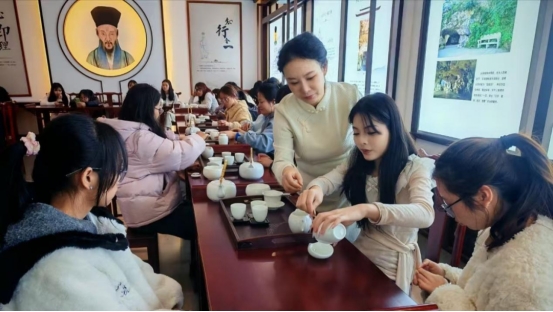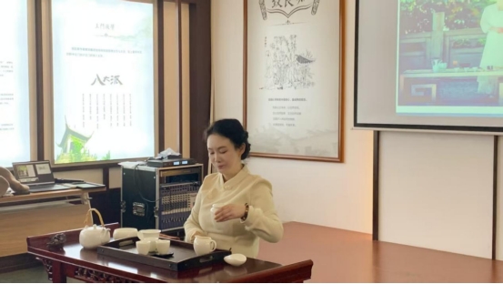 理论教学结束后,学员们领取茶具分组实操。屠小芮穿梭于茶席之间,逐一纠正握壶角度、注水节奏及敬茶姿态。她轻托学员手腕调整力度,耐心讲解“悬壶高冲”与“低斟暗流”的意境之别。现场老部员亦主动担起“传帮带”之责,与新成员结对练习,分享控温、赏茶、闻香等细节心得。茶室内,瓷具轻碰声与低语交流声交织,新老茶人于协作中体悟技艺传承的温度。