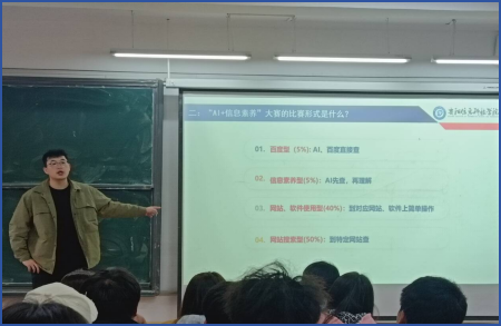 2026年3月25日中午12点10分,pp电子官方网站在C207教室顺利举办2026 年“大学生AI + 信息素养”大赛专题宣讲会。本次宣讲由王志翔老师主讲,面向全校学生深度解读赛事详情、备赛要点与激励政策,现场学习氛围浓厚。
