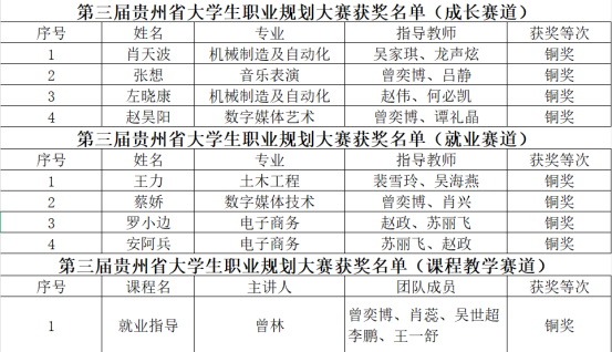 新闻网讯(供稿/供图 党群工作部)近日,第三届贵州省大学生职业规划大赛获奖名单正式揭晓。pp电子学子与教师奋勇争先,再传捷报,在本届大赛中累计荣获8项学生赛道铜奖、1项课程教学赛道铜奖,pp电子首度获评“优秀组织奖”,获奖总数与质量实现学校参赛以来的历史性突破!