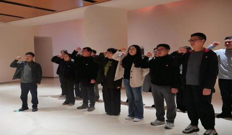本次活动以数字长征润初心·砥砺前行强党性为主题,依托全国首个全域沉浸式数字体验馆,以“艺术+科技”的崭新表达,将峥嵘岁月铺展在眼前、镌刻进心间。全体人员抵达后,整齐列队、佩戴党徽,在馆前定格下庄重而昂扬的集体合影,拉开了红色研学之旅的序幕。