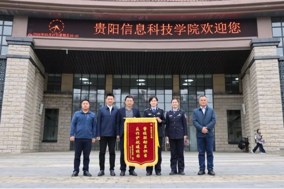 宣讲活动结束后,詹凯和黄晓儒向贵安新区公安局赠送锦旗,感谢公安部门长期以来对校园安全工作的鼎力支持与悉心帮扶,并对本次反诈宣传活动的精心部署、高效落实致以诚挚谢意。