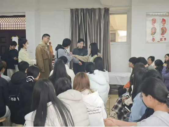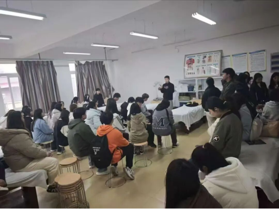 活动现场,杨波围绕三大核心内容展开分享:一是系统科普中医九大体质,详细讲解平和质、阳虚质、阴虚质、气虚质、痰湿质、湿热 、气郁质、血瘀质、特禀质的核心特征与辨识方法;二是深入解读艾灸养生的原理、适用场景与规范操作要点,结合实操演示帮助同学们掌握基础艾灸技能;三是针对同学们日常遇到的亚健康问题,分享科学调理方案。讲解结束后,杨波针对同学们提出的体质调理、艾灸实操、日常养生等问题逐一耐心答疑,现场互动氛围热烈,同学们纷纷表示收获颇丰。