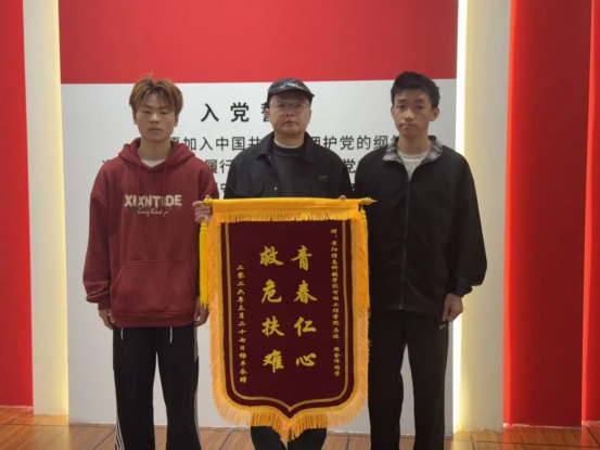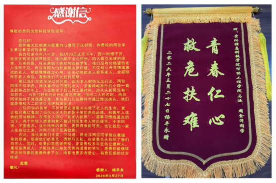 事后,老人家属杨先生专程来到学校,向周金洋、马进两名同学表达诚挚谢意,亲手送上锦旗和感谢信。感谢信中写道:“两位同学不仅及时帮助老人脱离困境,更挽回了一个家庭的完整,让家属深切感受到当代大学生的责任与担当、善良与热忱。”朴实的文字饱含真情,既是对两名学子善举的高度肯定,也是社会对pp电子人才培养成果和学子良好素养的充分认可。