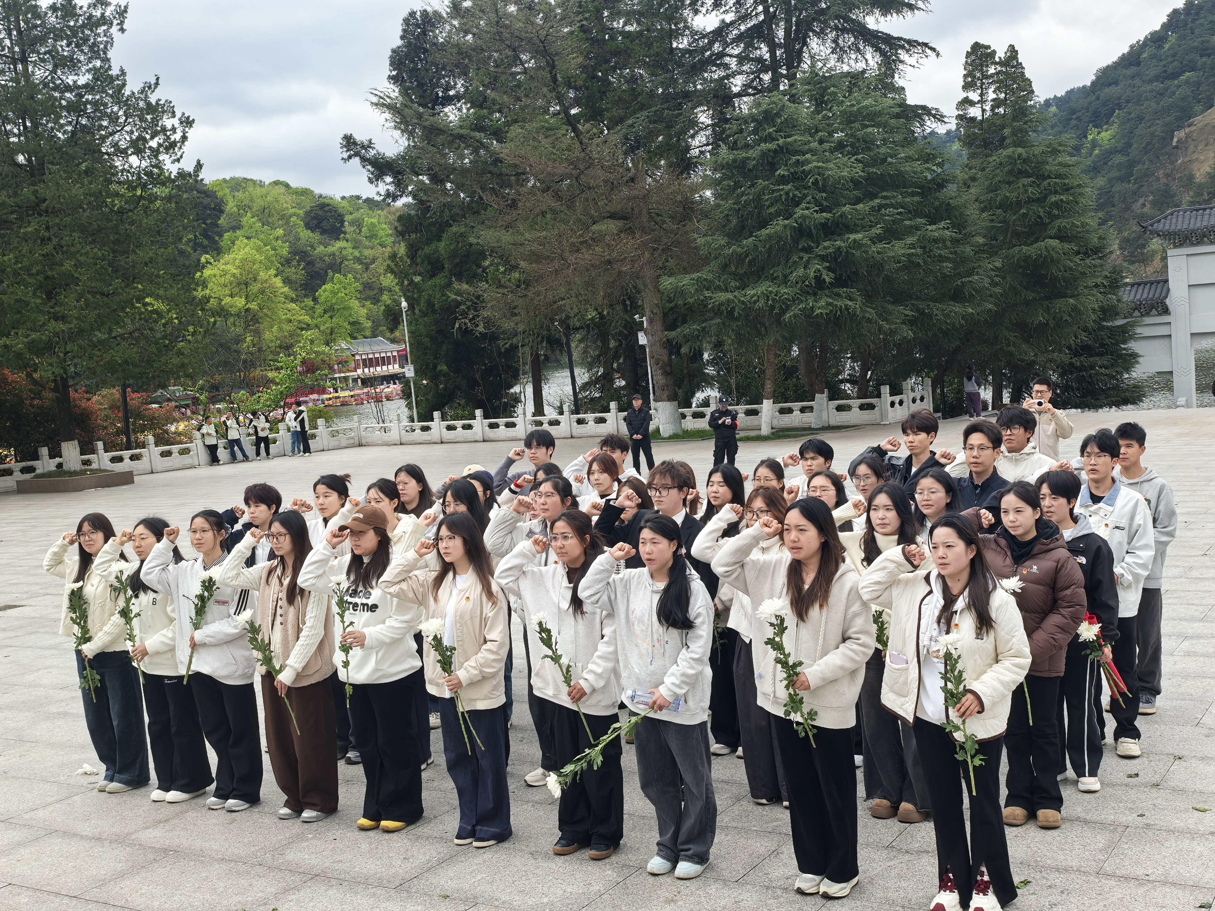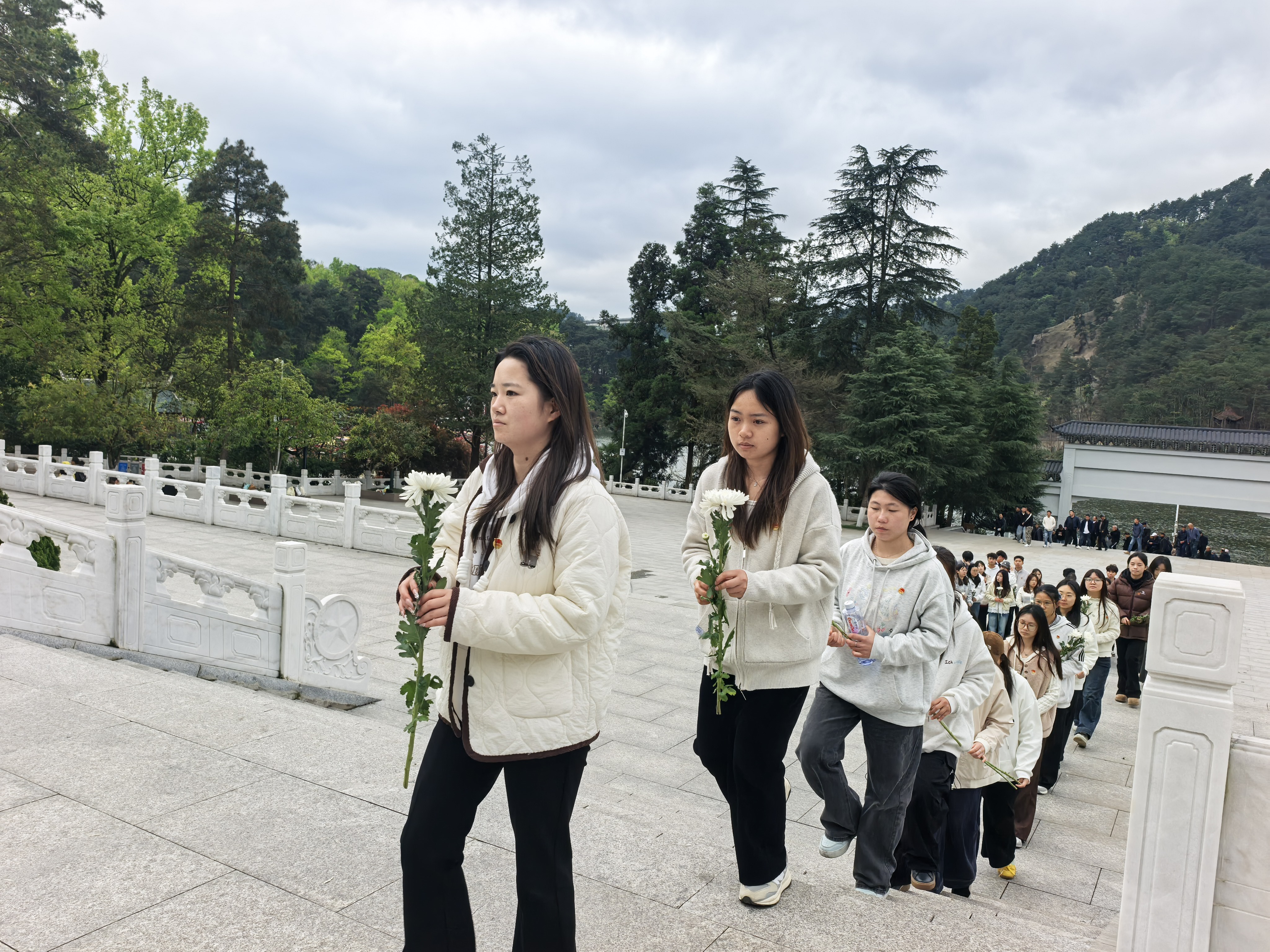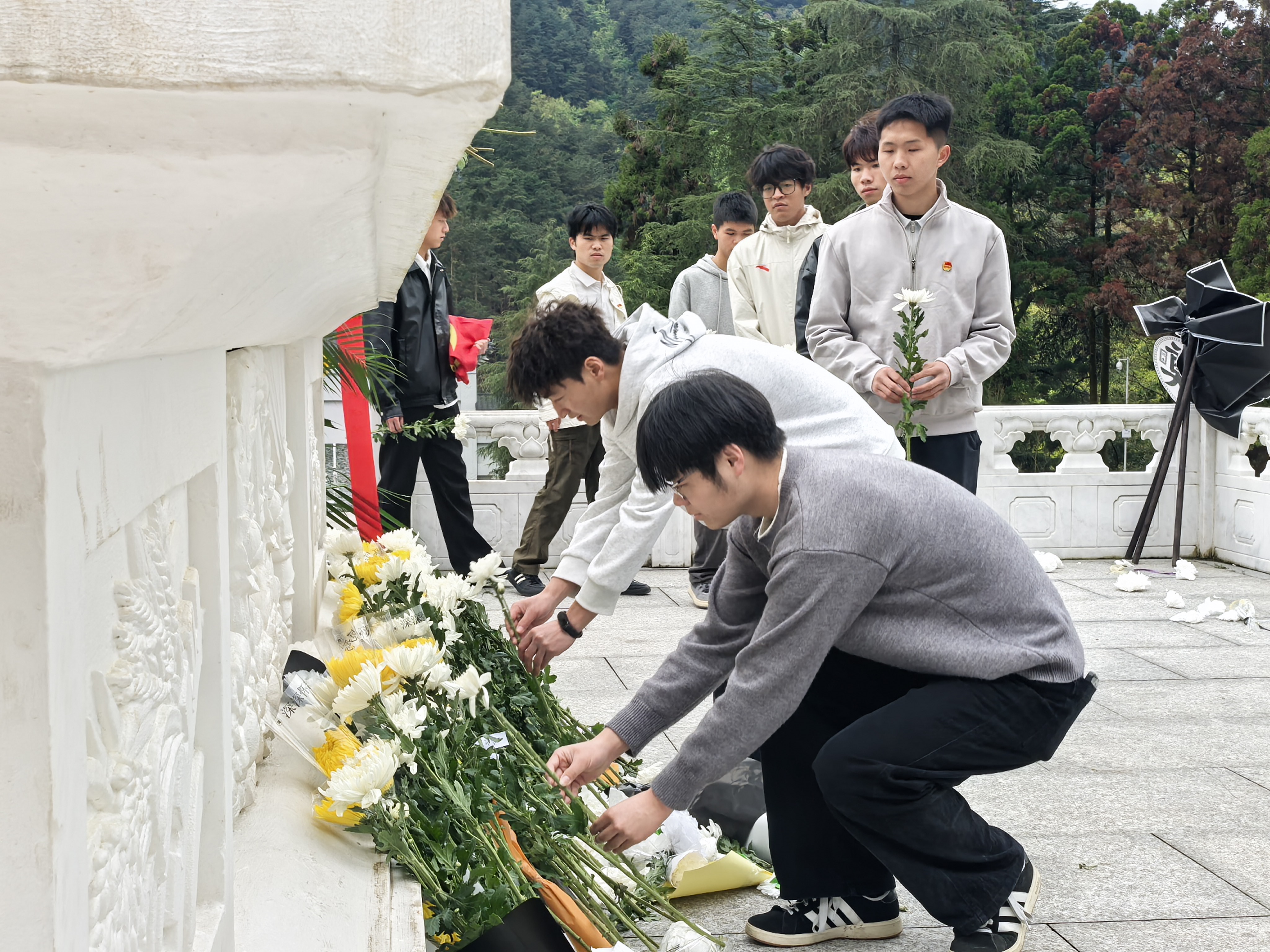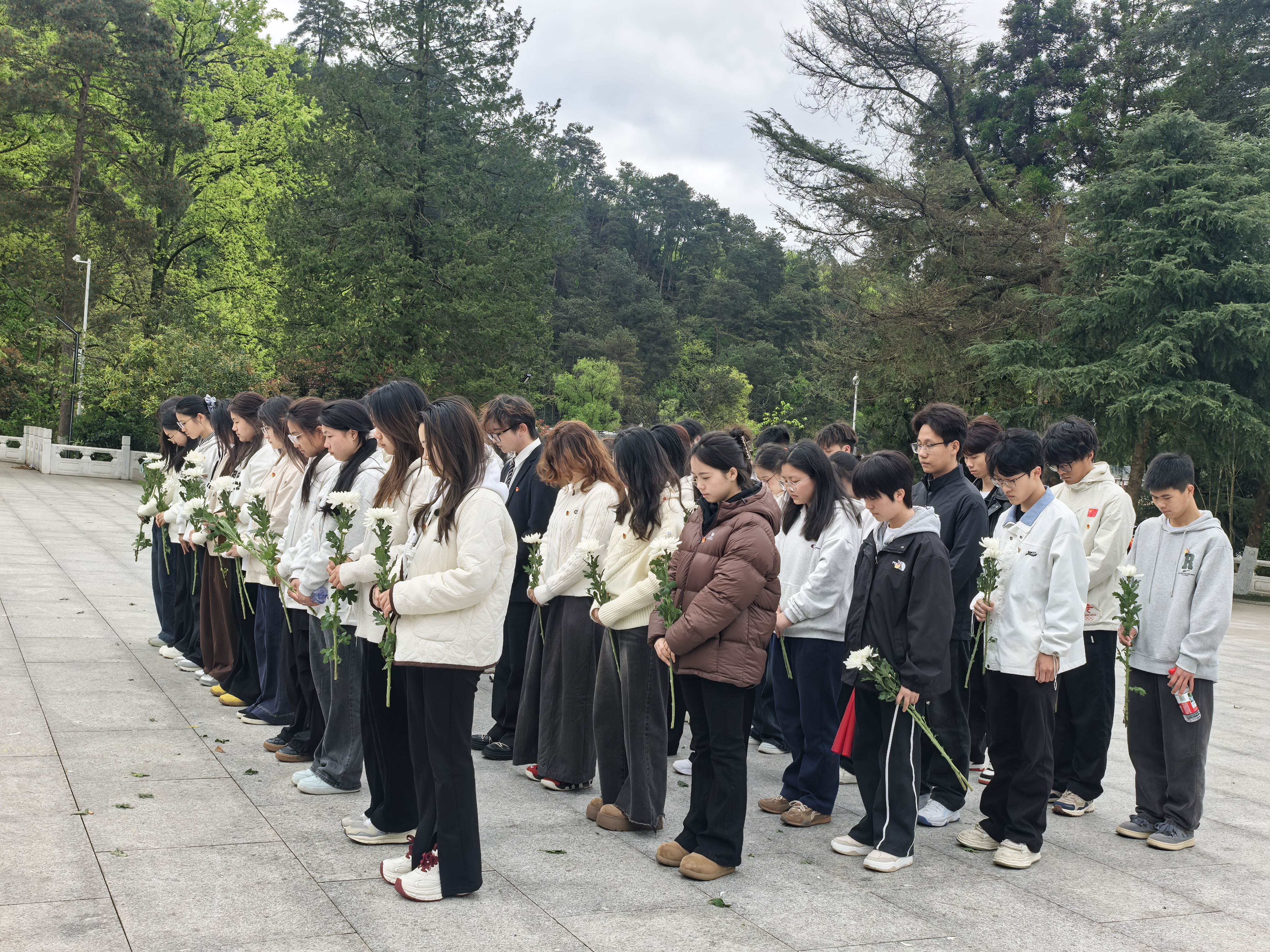 默哀毕,师生们手持寄托哀思的菊花,依次绕行纪念碑,瞻仰烈士英名,并逐一敬献鲜花。一朵朵鲜花,承载着崇高敬意;一次次驻足,凝聚着对历史的铭记与对未来的期许。
