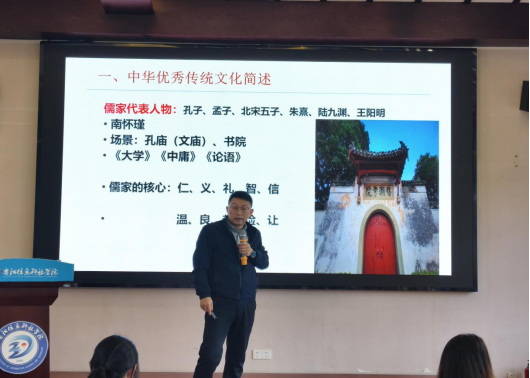 学校党委委员、纪委书记、阳明书院执行院长黄晓儒以“中华优秀传统文化与大学生个人素养培育”为主题,结合阳明文化“致良知”“知行合一”核心思想,深入解读中华优秀传统文化的时代价值,将传统文化精髓与思政教育、个人素养培育有机融合,引导青年学生在文化滋养中锤炼道德品格、树立职业理想、强化责任担当。