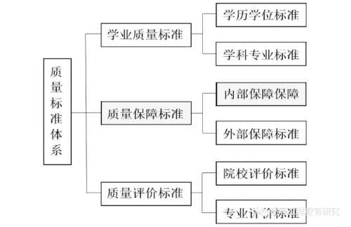 质量为王,标准先行。高等教育质量标准代表着一个国家高等教育的发展水平。提高质量,是我国高等教育发展的核心,无论是质量的形成,还是质量评价、质量比较、质量保障,都离不开质量标准这个基准。高等教育质量标准是一个体系,包括学业质量标准、质量保障标准和质量评价标准(见图1)。