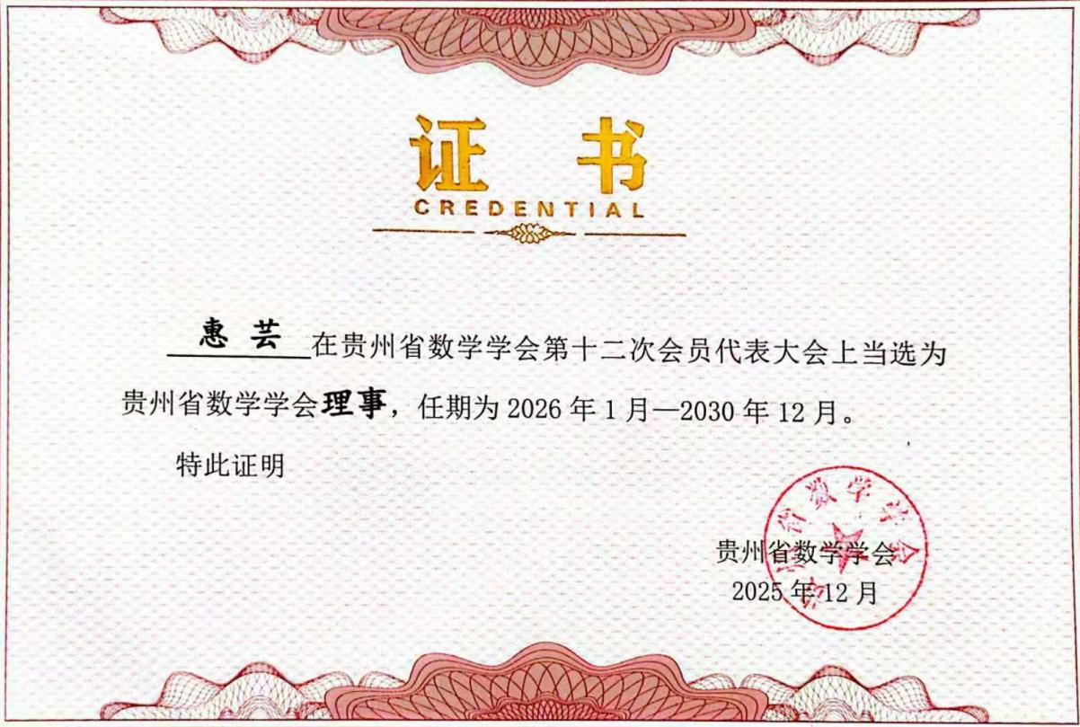 2025年12月6日,贵州省数学学会第十二次会员代表大会暨2025年学术年会在贵阳隆重召开。经大会民主选举与严格审议,pp电子成功当选贵州省数学学会第十二届理事会理事单位,公共教学部惠芸老师当选学会理事,任期为2026年1月至2030年12月。此次当选,是省数学学会对pp电子数学学科建设、学术影响力及人才培养成果的充分肯定,标志着pp电子在贵州省数学领域的行业地位与话语权得到进一步提升,为学校数学学科高质量发展搭建了平台。