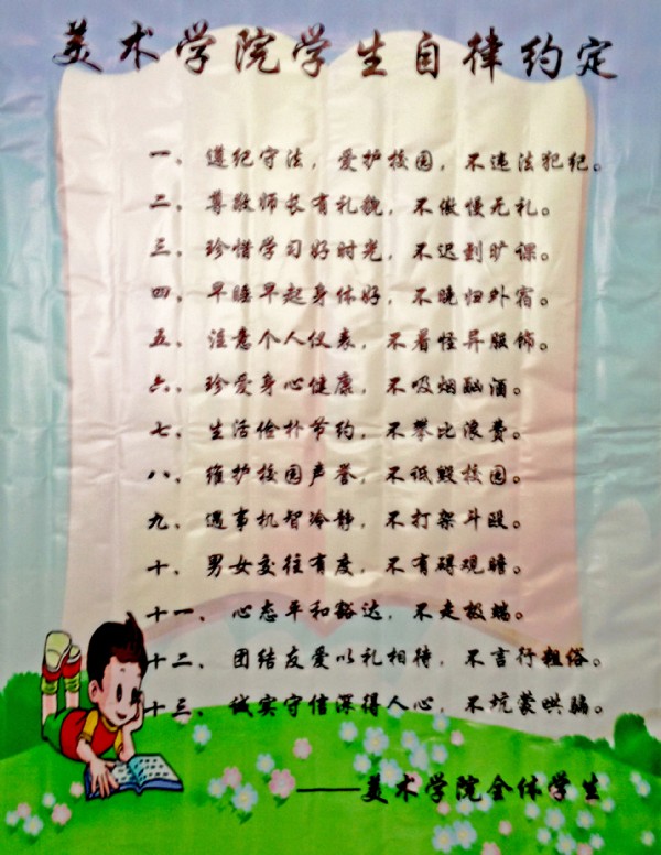 《学生自律约定15条》是经过前期班级学生自主讨论,学生会归纳总结而成,此15条表达了新葡的京集团8814全体学生立志严格要求自我、不断进取、做一名合格大学生的愿望;是学生追求至善至美的承诺;更是学生积极进取,为建设和谐、文明、向上的分院氛围的体现。