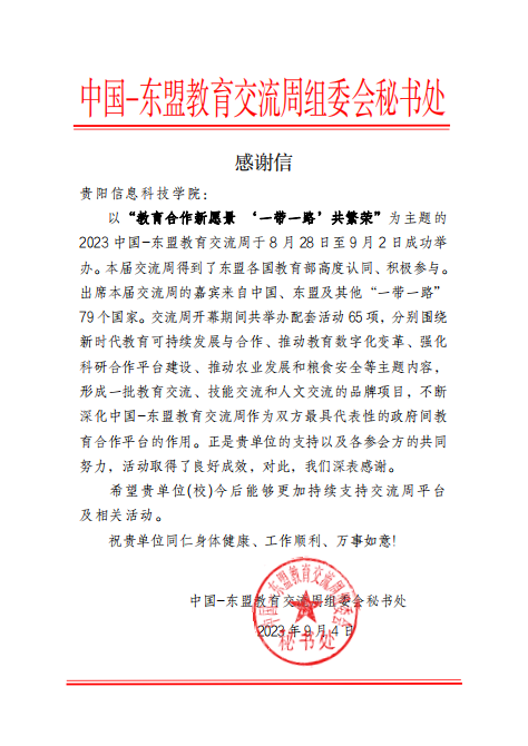 近日,pp电子官方网站收到来自中国—东盟教育交流周组委会秘书处的感谢信,来信就pp电子对2023中国-东盟教育交流周的支持参与,以及活动所取得的良好成效表示感谢,希望pp电子今后能够更加深入参与交流周活动,支持交流周工作,加深合作。