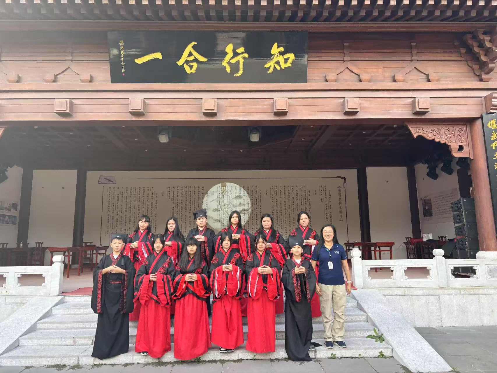 在学校的精心安排下,师生们在校园内便深度体验了丰富的非遗与传统文化:跟着贵州思南非遗剪纸非遗传承人陈露露老师学习剪纸技艺,认真刻画属于自己的作品,感受传统手工艺的精妙;在张可欣老师的精心策划下,研学团沉浸式参与了贵州少数民族非遗音乐赏析课 —— 伴着苗族飞歌的婉转、侗族大歌的多声部共鸣,师生们在原生态旋律中轻舞,近距离聆听少数民族同胞的嘹亮歌喉;走进学校阳明书院,学习体验儿童德行礼与传统释菜礼 —— 换上雅致汉服,在古色古香的书院场景中,学习中华传统礼仪,在拜师礼、敬师茶的互动中,体悟 “尊师重道” 的中华传统美德。
