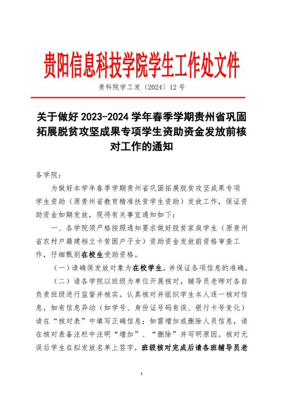 转发:关于做好2023-2024学年春季学期贵州省巩固拓展脱贫攻坚成果专项学生资助资金发放前核对工作的通知