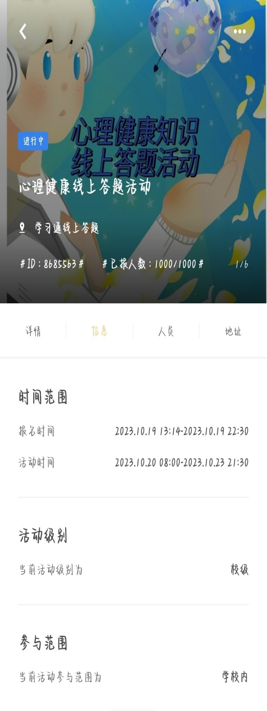 此次活动在“到梦空间”上发布,面向全校学生,可自由报名,报名成功后即可参加线上答题,题目主要包括大学生心理健康基本知识以及有效应对心理问题的方法,在规定时间内完成答题并提交即可。活动共1000名同学参与。