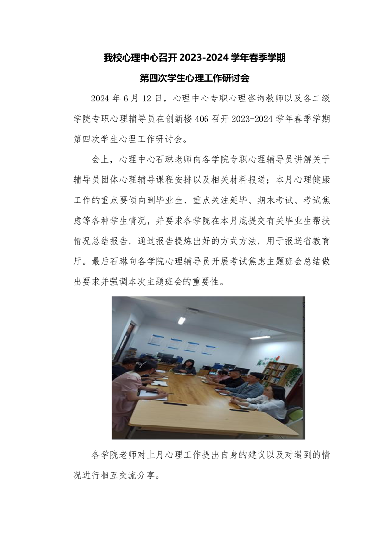 大学生心理健康教育与咨询中心组织心理辅导员召开2023-2024学年第二学期第4次学生心理工作安全会议