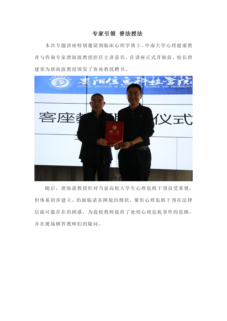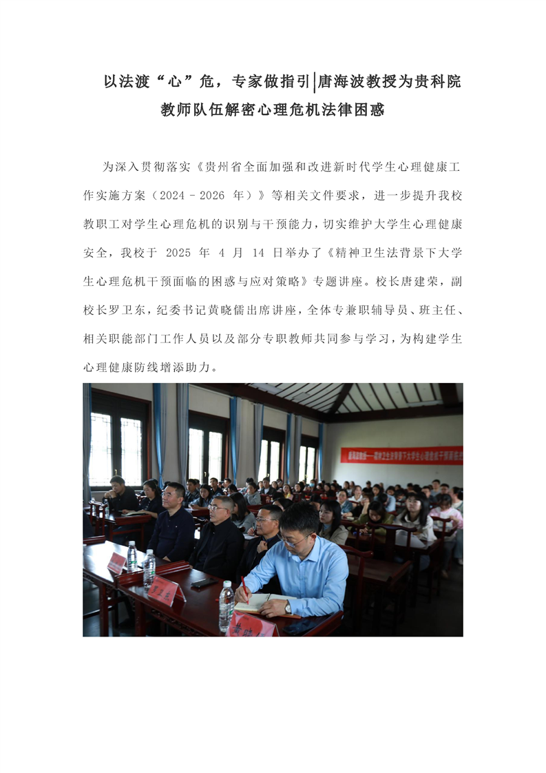 以法渡“心”危,专家做指引唐海波教授为贵科院教师队伍解密心理危机法律困惑