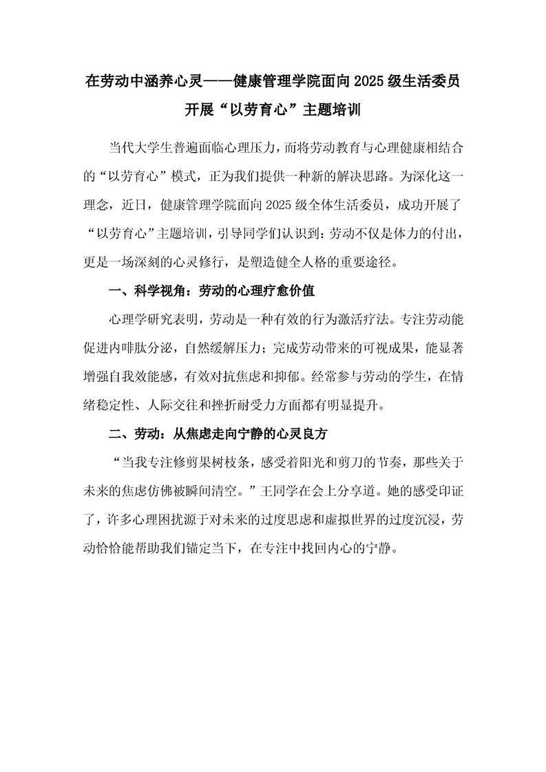在劳动中涵养心灵——健康管理学院面向2025级生活委员开展“以劳育心”主题培训
