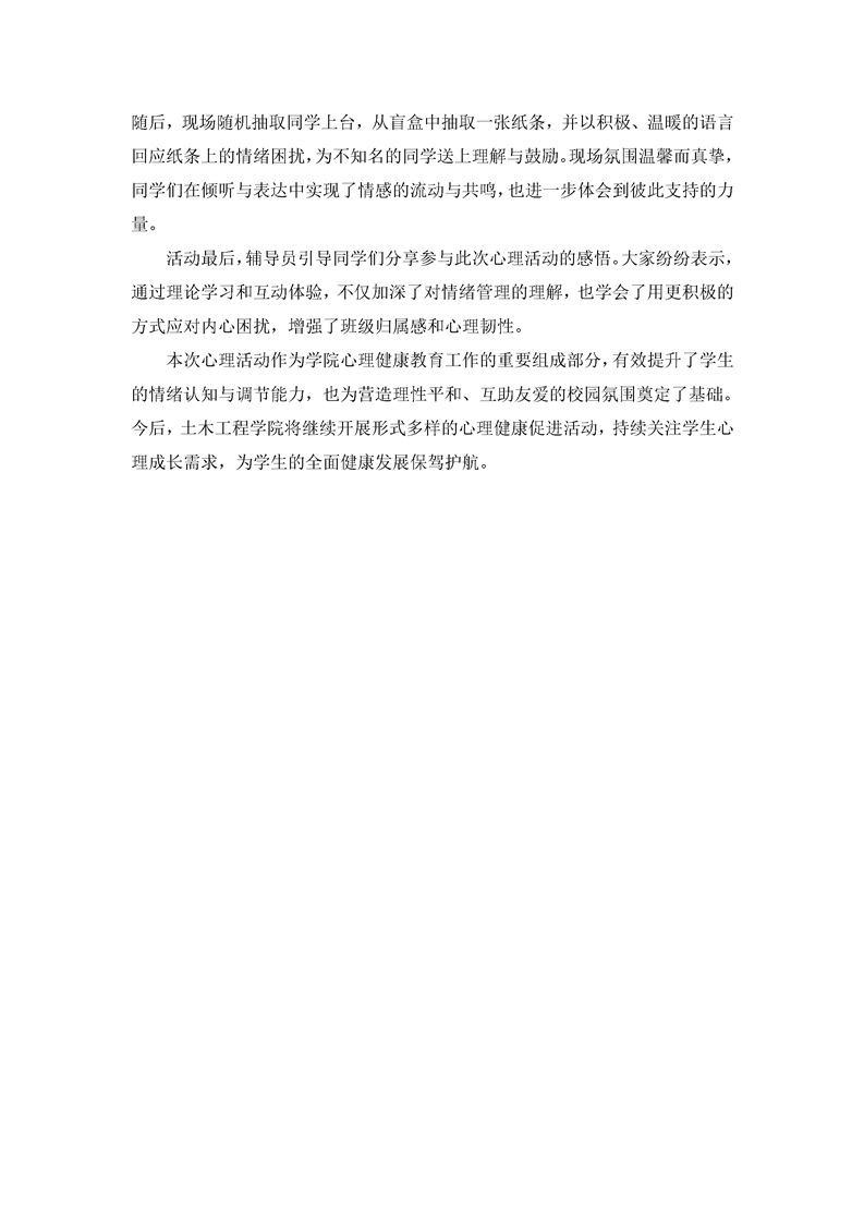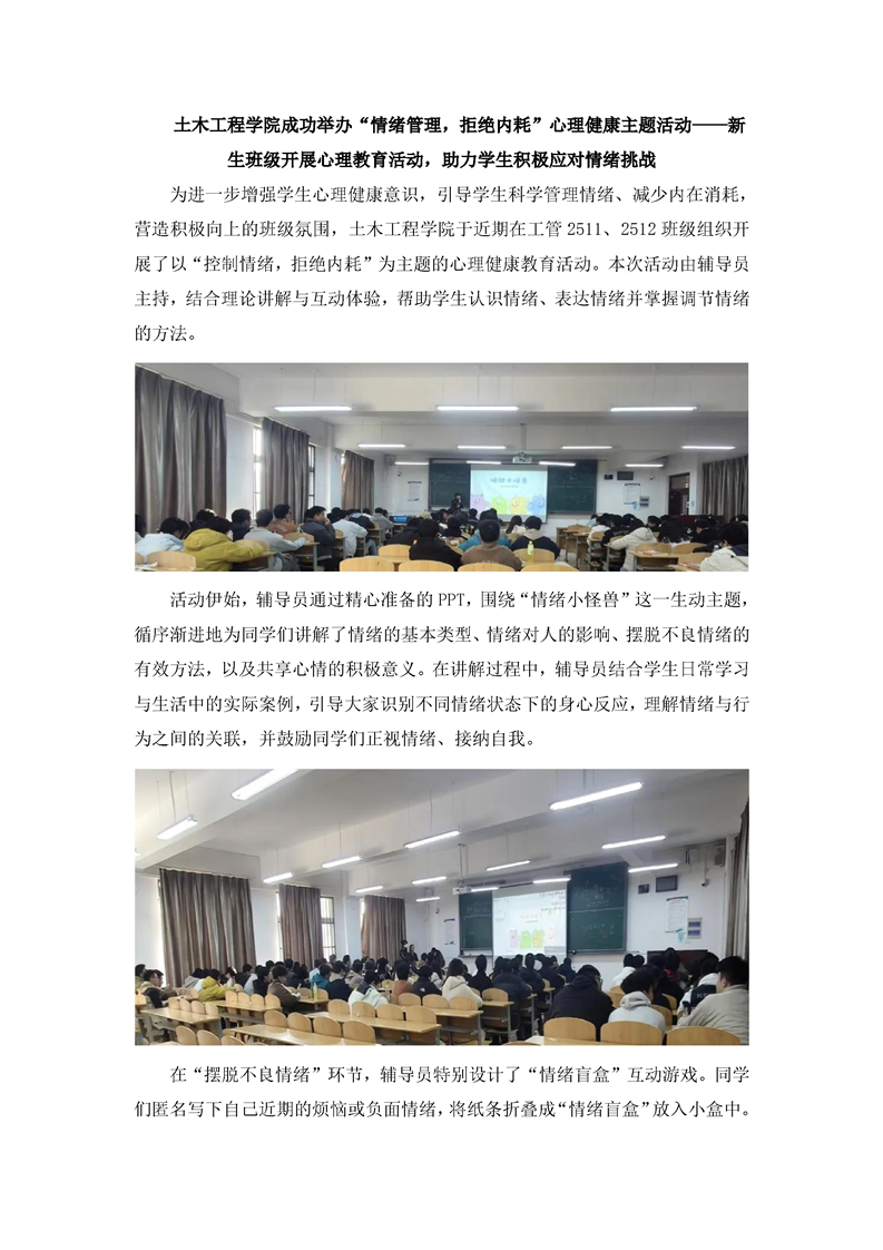 土木工程学院成功举办“情绪管理,拒绝内耗”心理健康主题活动——新生班级开展心理教育活动,助力学生积极应对情绪挑战