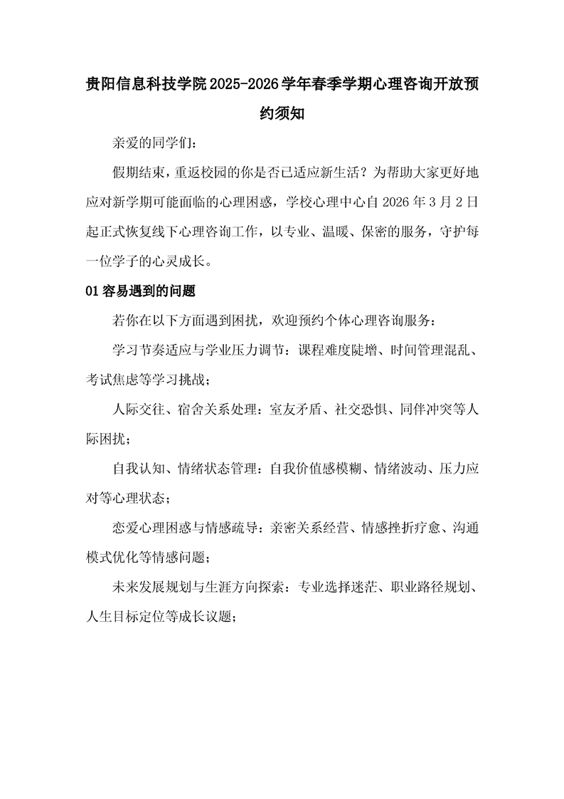 贵科院2025-2026学年寒假心理咨询排班表